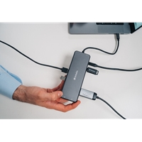 The two HDMI ports on the Pro Multiport Hub allows you to expand your display onto dual compatible TVs or monitors. It supports Ultra HD 8K razor-sharp resolutions, providing feature-rich content for the ultimate immersive experience. The DisplayPort also provides connection to a third monitor for wrap-around viewing in 4K Ultra HD resolution. Even at higher frame rates, the hub still provides smooth and continuous viewing without any loss or lag.